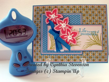 When I first saw this picture, the Tempting Turquoise pillow just sat up and said “Hello”. So, I matched it up with Old Olive, Whisper White and one of the returning colours, Pink Pirouette! A little Regal Rose for the flowers and we have a bright, tropical theme for this card.