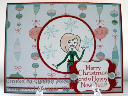 I’ve come to really like the Candy Cane Christmas Designer paper, it has such fun images! In my mind, Tess is a fun type of girl – so it just seemed right to use it. The narrow stripe across the bottom is actually a piece of the Designer paper matted onto Real Red cardstock. I used the Stamp-a-ma-jig to add the snowflakes from Serene Snowflakes to the circle, coloured Tess with those marvelous Stampin’Write Markers, and added some Dazzling Diamonds glitter to the snowflakes. It’s difficult to see it in the picture, but it is there. The sentiment was cut out with the Curly Label punch and matted on a piece cut from the Decorative Label punch. Silver Glimmer Brads finish it off.