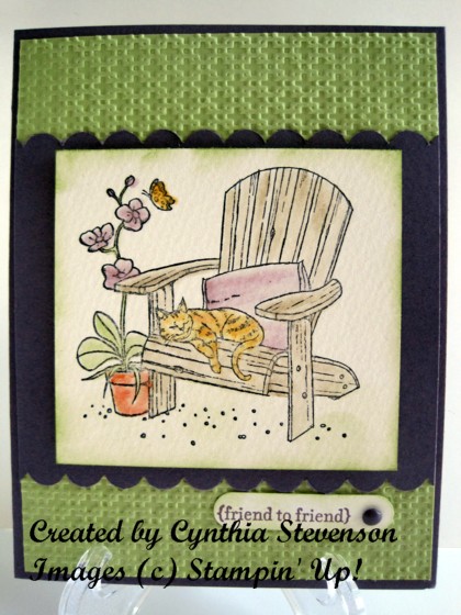I also knew exactly what stamp set I was going to use and that I would go well beyond 10 minutes for this challenge. But, the cat in the lawn chair just belongs in this garden so that is that!