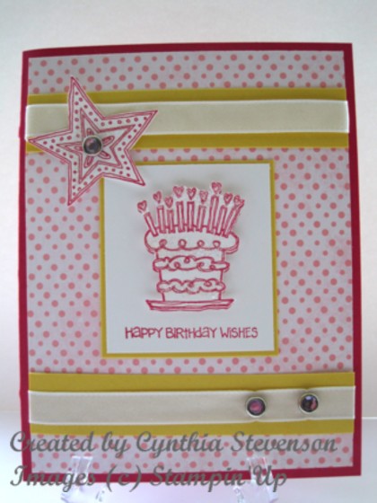 I took this card from my May 18th post and added some layers. This card uses the fun set, Fun & Fast Notes (113500) with Melon Mambo and Daffodil Delight cardstock. I added a layer of polka-dots from the Tea Party Designer paper (retiring), some 3/8″ Whisper White Taffeta Ribbon and some Ice circles Rhinestone brads. The main image was stamped again on a scrap piece of cardstock, cut out, sprinkled with Dazzling Diamonds Glitter and adhered to the first image with Stampin’ Dimensionals. The star image was also treated with the glitter.
