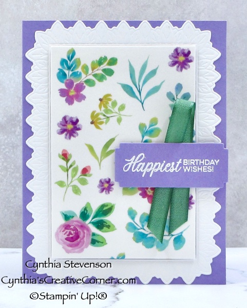 I started with a card base of Highland Heather because it’s so bright and beautiful and makes a great background for the Extraordinary Flora Washi Tape(165269). I must confess that I haven’t used this Washi Tape very often as I have a “love/hate” relationship with it, lol. I tend to get wrinkles when putting it onto the Basic White cardstock, so it took a little extra time and extra inches of the tape to get this card wrinkle-free.
