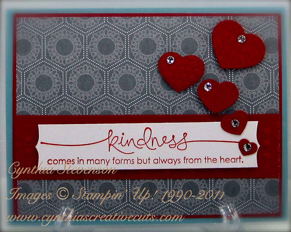 There are a couple of new items from the Occasions Mini Catalogue on this card. The hearts created with the new Fashionable Hearts Embosslit and the line of embossed hearts using the new Adorning Accents embossing folders and, I fancied up the ends of the greeting strip using the Decorative Label punch – sweet!