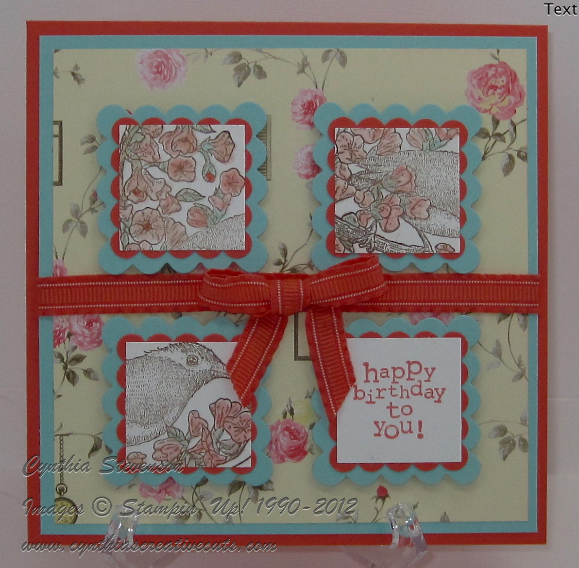Accessories: 1-1/4″ Square Punch(119865), Scallop Square Punch(119884), Big Shot(113439), Scallop Squares Duo Die(120903), 3/8″ Calypso Coral Ruffled Ribbon(122976), Blender Pens(102845 pkg of 3), Mini Glue Dots(103683), Stampin’ Dimensionals(104430), Snail Adhesive(104332), Simply Scored Scoring Tool(122334)