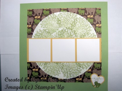 I used the lid from one of my casserole dishes to trace the 9″ circle and then cut it out with my paper snips. The tree image from Pendant Park(page 118 Idea Book) was stamped using Old Olive Classic ink and then Certainly Celery Ink. I think the elephants from the Tall Tales Designer Paper add a great background for the pictures that will find a home on this page.