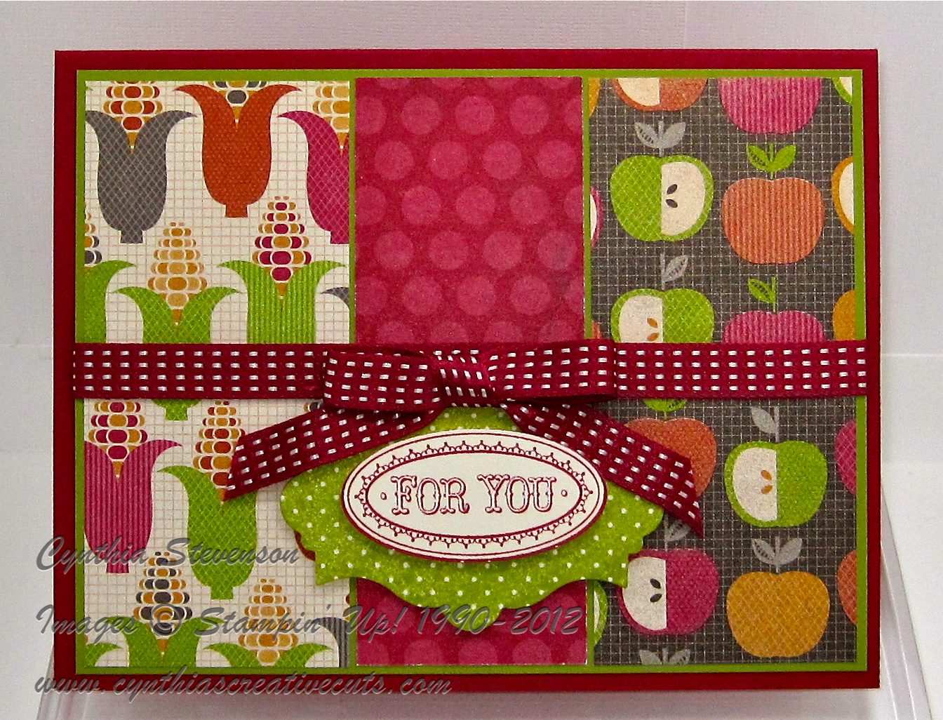 Now, on to this card…. I used a 2012-2014 In Color called Raspberry Ripple for the card base and added a mat of Lucky Limeade (2011-2013 In Color). Then 3 sections of patterns from the Orchard Harvest pack. The ribbon and bow is the matching Raspberry Ripple Stitched Satin ribbon that you can get FREE with a $50 purchase this month. Check out our Back to Spool promotion.