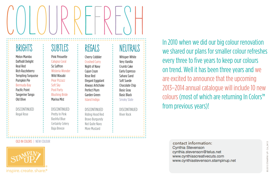 As you can see, there are quite a few colours going away and more being added to the Colour Families. I’m really excited about this Refresh and so happy to see some of my favourites returning. Bermuda Bay, Crushed Curry(yep, after I used it I liked it!) and Soft Sky are just a few. And, check out that one New Colour – Smoky Slate! Sounds fabulous!