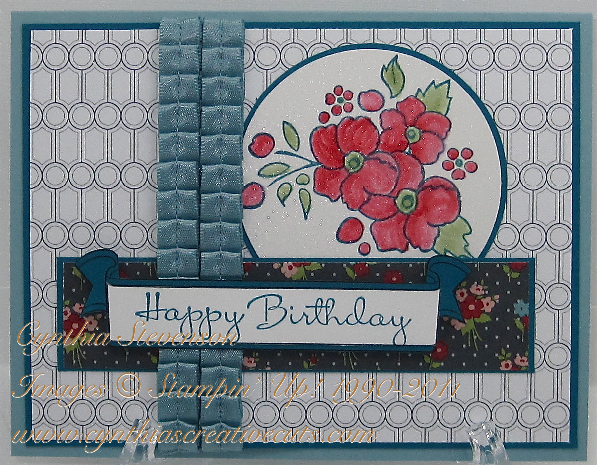 I stamped the larger flower image onto shimmery white card stock using Island Indigo classic ink. Then I carefully colored the flowers and leaves with a blender pen using Riding Hood Red and Pear Pizzazz. You do need to color carefully if you’ve stamped the outline with classic ink. It will smudge.