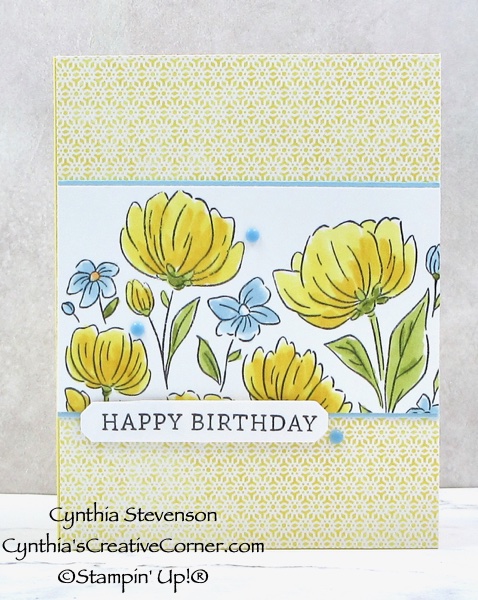 It will be a while for us to see flowers in our garden but there are always stamps to get an early start to the flowering season! I started with a new background stamp called Flowers Fair which will be available to you in March. I went with Daffodil Delight, Balmy Blue, Pumpkin Pie and Old Olive Stampin’ Blends for this sunny batch of blooms and backed the panel with Balmy Blue.
