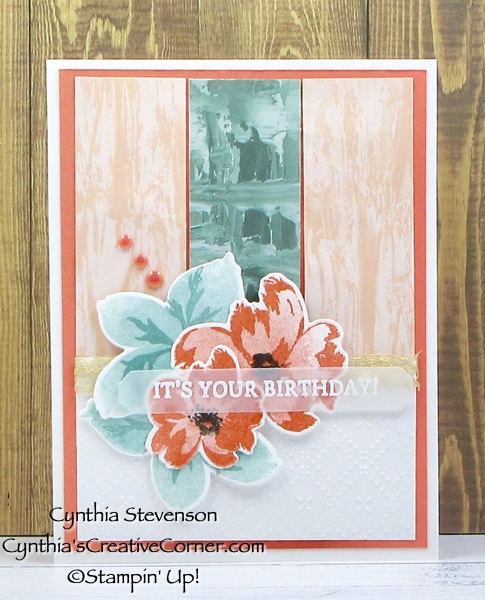 This time to show off a couple more designs in the designer paper pack. I also had fun stamping those flowers in Calypso Coral with leaves of Lost Lagoon. This is a two-step stamping technique so I usually stamp the darker detail first and then add the light background by “stamping off” the colour.