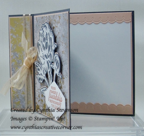 This is a fun and easy technique. Just cut a piece of cardstockto 11″ x 4-1/4″. Then score it at 5-1/2″ and again at 4-1/4″. Fold at the 5-1/2″ mark and then again at the 4-1/4″ mark. Then adhere that 1-1/4″ piece to the card to leave the “binding” that’s shown on the left side of this card. See this open book below.