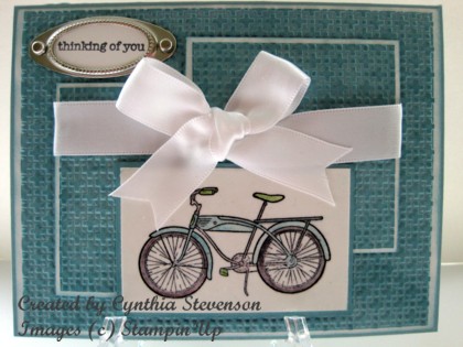 I turned the layout on it’s side so I could focus on the Bicycle image. This could be called a monochromatic card as I only used 2 colours for it. The Square Lattice Die, found in the Summer Mini Catalogue (page 24) added just the right amount of interest. I sponged Baja Breeze Classic Ink all over each embossed piece as well as the edges of each square.