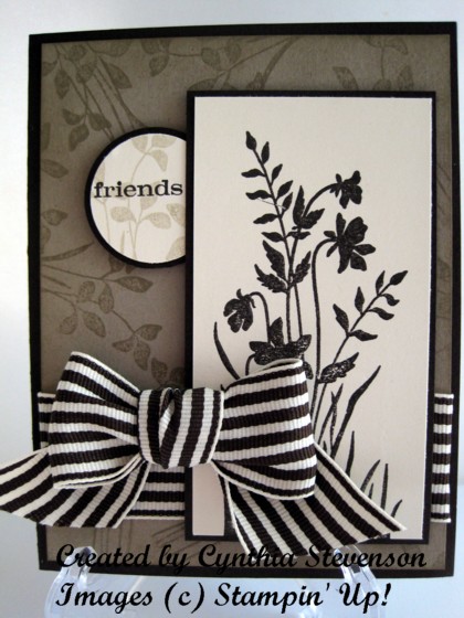 I started with a card base of Early Espresso(I love the richness of it) and added Crumb Cake(Yummy) and Very Vanilla. I made my own background paper by using the small stem image from Just Believe(120453) and “stampin off” with Crumb Cake classic ink and then sponged the edges with the same ink. The main image was stamped with Early Espresso classic ink and matted on Early Espresso. I stamped the small Very Vanilla circle using the “stamping off” method again and then stamped “friends” over top. Yes, I stamped this all first and then used the 1-1/4″ punch to make a perfect circle. Then I wrapped it all up with a length of 1-1/4″ Early Espresso Striped Grosgrain ribbon and a lovely bow with help from Lee Conrey’s Magic Bow maker.