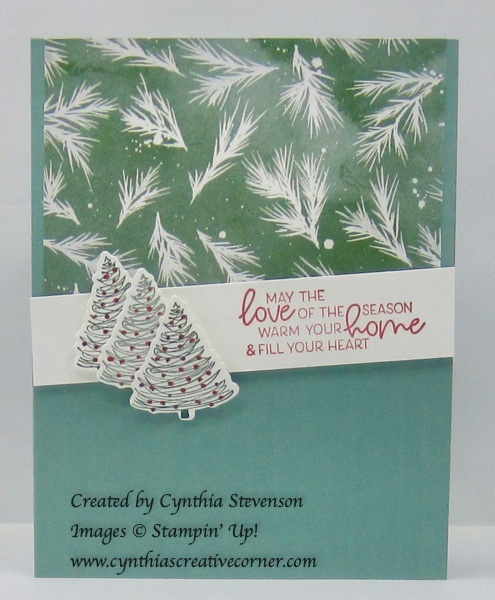 This is a simple technique that adds just a touch of special to a simple card. First, I used the scoring tool on the Paper Trimmer to add stripes 14″ apart on the card base. Then I cut a separate piece of the Soft Succulent and the Painted Christmas designer paper(156292) to layer on the top. The angled greeting needed something else, so I added that trio of tiny trees to dress it up a bit.