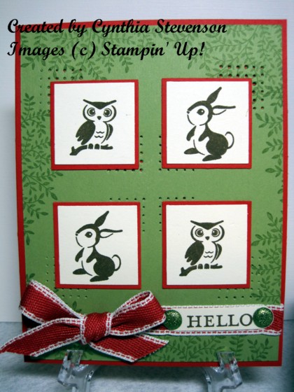 The owl and bunny were stamped with Soft Suede classic ink on Very Vanilla, punched out with the 1-1/4″ Square Punch. The Poppy Parade layers were punched out using the 1-3/8″ Square Punch.