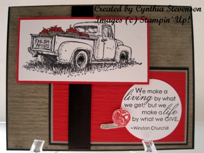 So here we go – the card base is Early Espresso and I used one of the Texturz plates, Distressed, and my Big Shot to emboss the Crumb Cake layer. It was then sponged with Crumb Cake classic ink to bring out the embossing. I also textured the smaller layer of Poppy Parade with the same Texturz plate. The truck image was stamped on Whisper White with Early Espresso classic ink and I used my Stampin’ write marker in Poppy Parade to colour the apples and a Crumb Cake marker to colour the baskets. The small apple image was coloured direct to stamp with Poppy Parade and Crumb Cake markers and cut out with my paper snips.