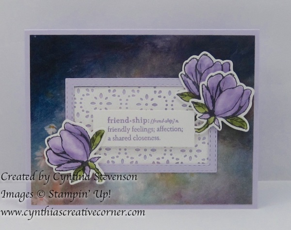 Of course, when one is thinking of a friend, why not add some beautiful flowers! I had these magnolias stamped and waiting for some ink, so coloured them with our Stampin’ Blends and placed them just so. There was also a piece of “lace” sitting on my table and I decided that it would be the perfect backdrop for that lovely greeting! I really love the purple theme on this card!