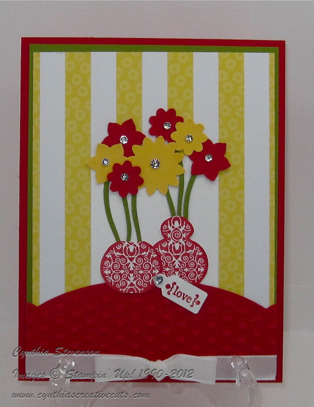 I used a piece of designer paper from the Retiring package called Big Top Birthday and got busy with the Boho Blossoms punch, the Bird Builder Punch(stems) and rhinestones!