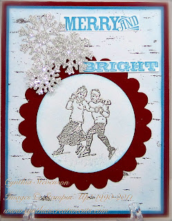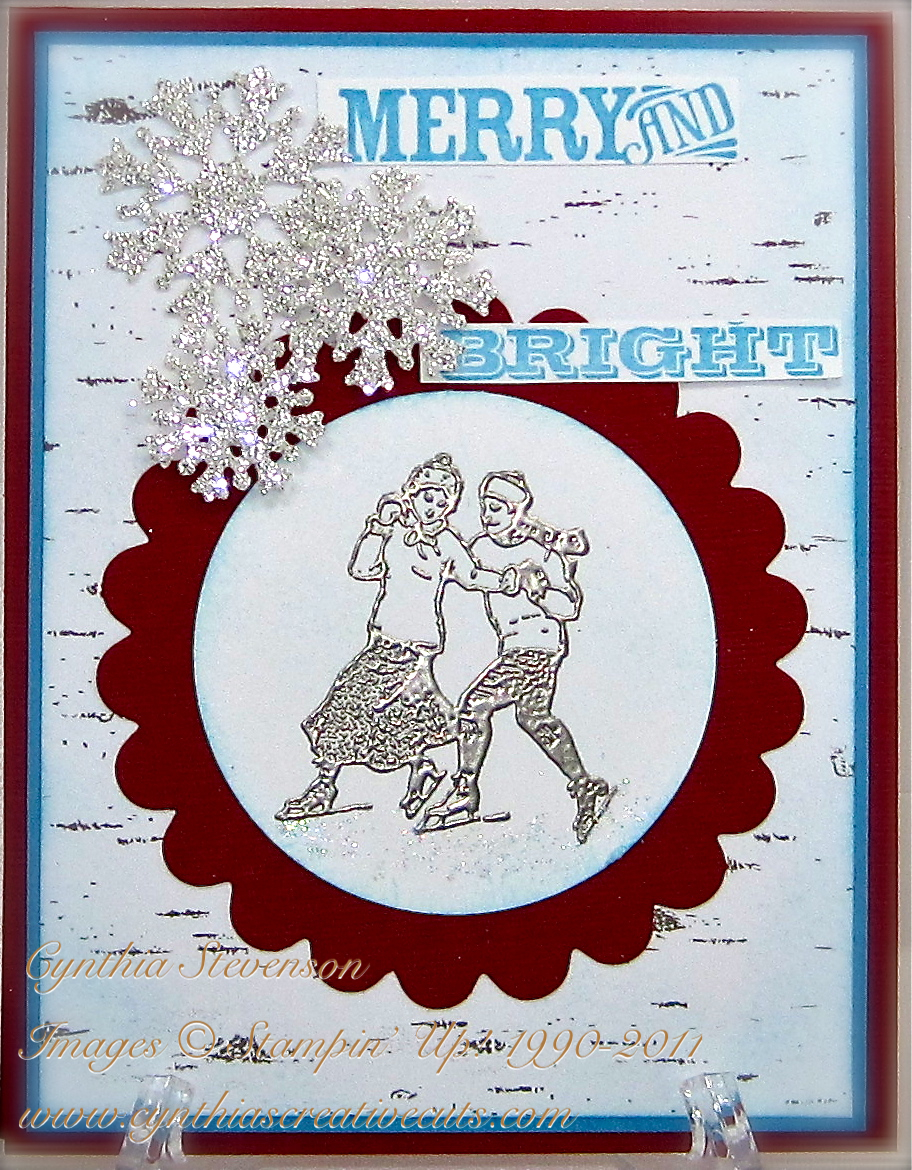 I paired it up with Merry &Type from page 31 of the Idea Book & Catalogue and a piece of designer paper from the Frostwood Lodge package. The skaters look great heat embossed in Pewter and the snowflakes help to give the winter feel that I was looking for.