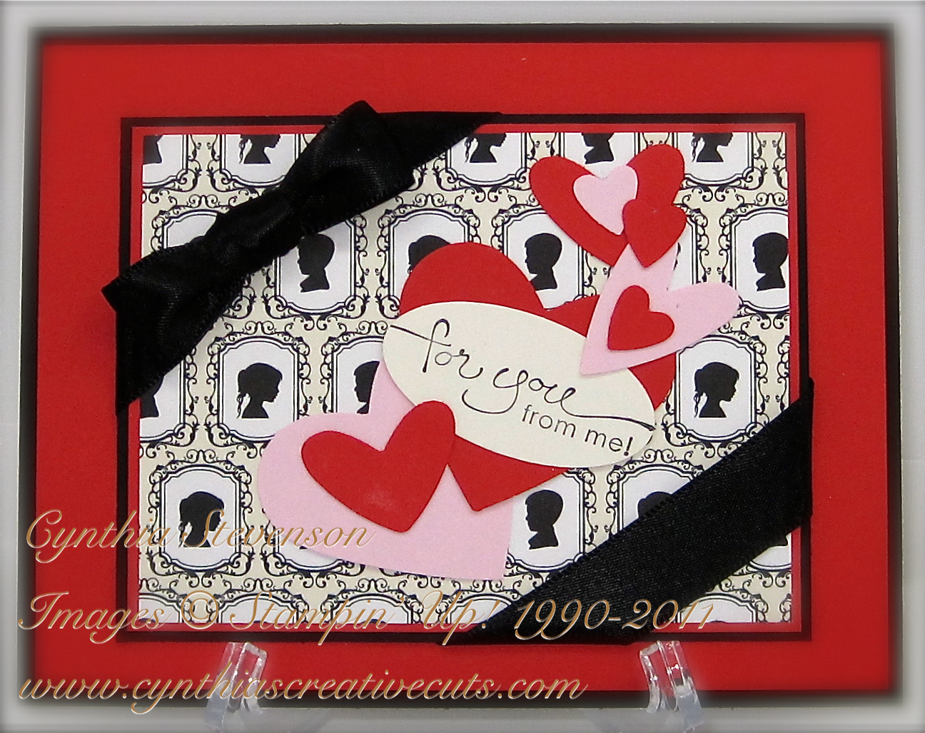Accessories: Simply Scored(122334), 5/8″ Basic Black Satin Ribbon(11785), Full Heart Punch(119883), Heart to Heart Punch(119881), Snail Adhesive(104332), Mini Glue Dots(103683)