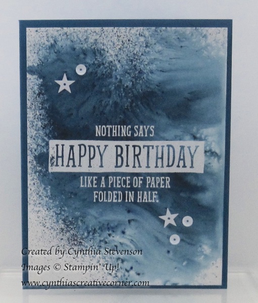 Pretty stellar don’t you think? I used the Prussian Blue Brusho® crystals and sprinkled them onto a 3-3/4″ x 5″ piece of Shimmery White cardstock and then used the Spritzer tool. The more you spray, the more the colour spreads so you can control how much colour you want.