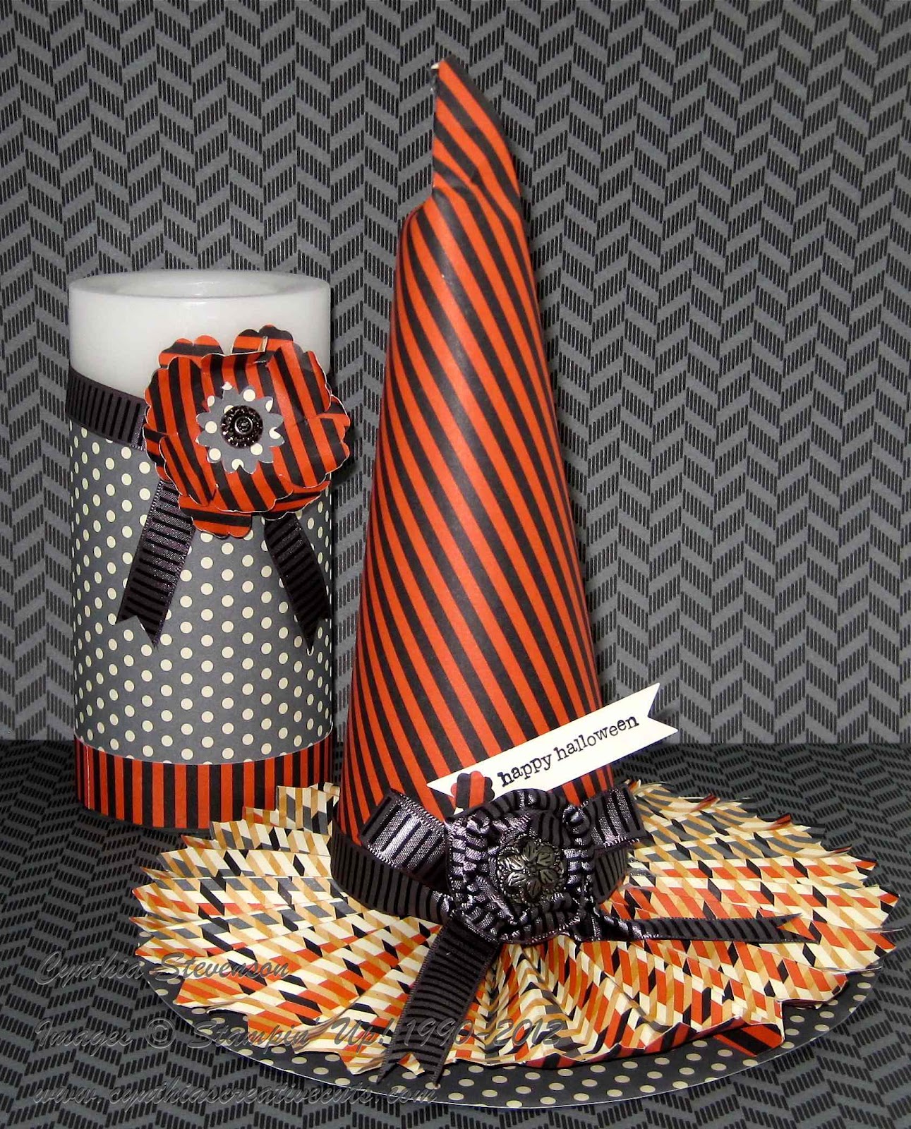 I don’t do a lot of 3D items and when I found the tutorial for this hat on Splitcoast Stampers just had to give it a try. The top of the hat uses a styrofoam cone and I got to work with Howlstooth & Scaringbone designer paper to create this little cutie. Check out the large rosette on the hat brim! It was created using the Designer Rosette Bigz XL die(big catalogue page 194) and Jumbo Sticky Rounds from the Holiday Catalogue(page 31). Rosette’s are not my “thing” but with a lot of patience, a few descriptive words (LOL) and help from the Sticky Rounds, I got it done!
