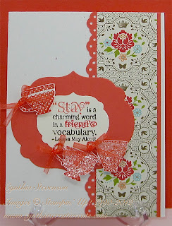 I started with a card base of Confetti White card stock(102028, page 181) and used up a few scraps of Everyday Enchantment designer paper and calypso coral to add the focal interest.