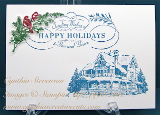 I stamped the lodge and greeting with Not Quite Navy classic ink. Then I decided that it needed a little more color so inked up the birds and branches with Stampin’ Write markers and cut it out. A Stampin’ Dimensional pops it up and still leaves this card simple and extra postage free!