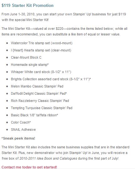 Have you been thinking of becoming a Stampin’ Up Demonstrator? I would love to have you join my Team and now is the perfect time. You can join up now and get the Mini Starter Kit for only $119.00 until June 30, 2010. This is a limited edition kit that includes over $220.00 of Stampin’ Up products and business supplies. As a new recruit, you will also receive a box of 2010-2011 Idea Book & Catalogues in July! The perfect tool to get you started! Check out my website and sign up today. I love my job!
