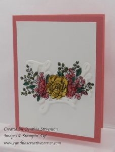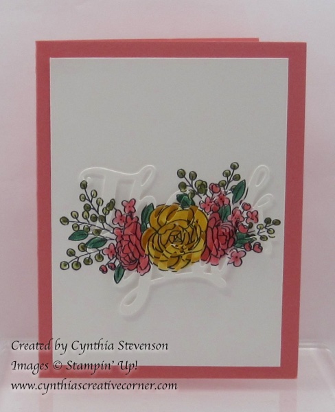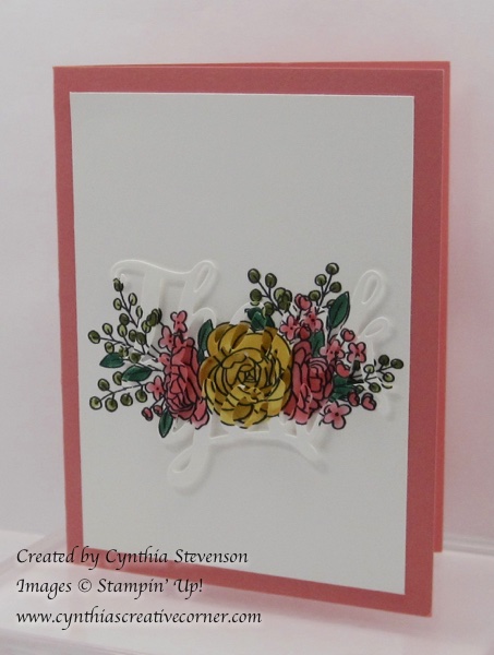 I started out by colouring the flowers on a piece of Whisper White that measured 3-3/4″ x 5″. Then stamped the flowers again on a piece that measured 3″ x 3-1/4″ and coloured them as well. Then it was just a matter of placing the Thank You die just so and cutting it out.