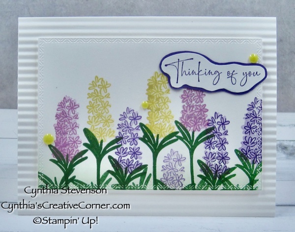 The panel the lilacs were stamped on was cut with the Textured Notes Dies(165555). It looked a little too plain on the white card base, so I used the Mini Corrugated 3D embossing folder to add texture. It’s easier if you cut a piece of Basic white to 5-1/2″ x 4-1/4″ to emboss and then adhere it to the card base. Then you have a firmer card that will sit more firmly when opened.