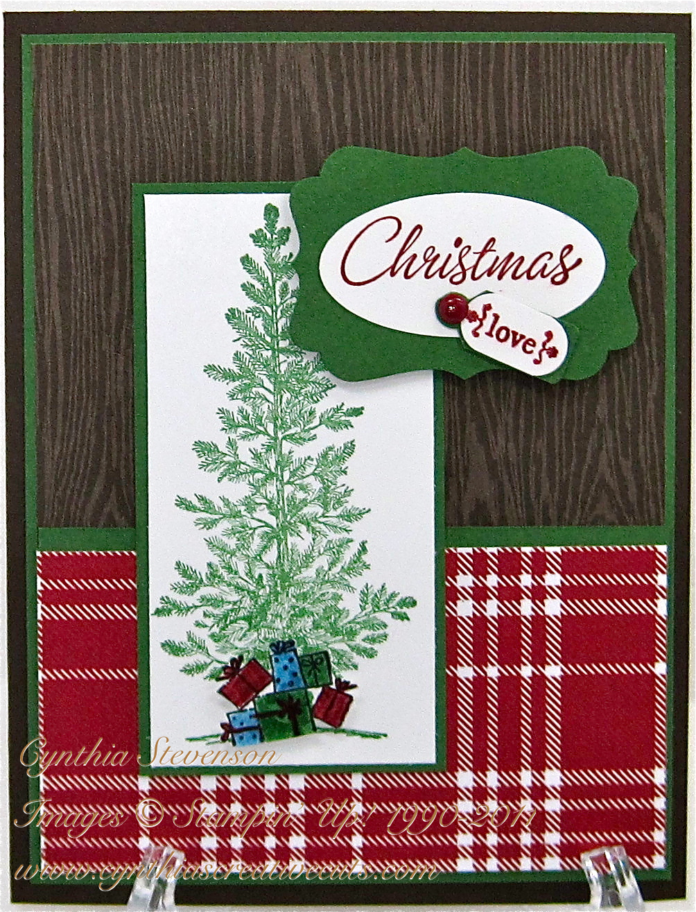 The designer paper from Frostwood Lodge(Holiday Mini, page 28) came in very handy here. I also pulled out a timeless stamp set, “Lovely As A Tree” for the focal image. Isn’t that pile of gifts cute? I used another timeless set called “Loads of Love Accessories” for them. They were colored with Stampin’ Write Markers and then carefully cut out to be popped up under the tree with a Stampin’ Dimensional.