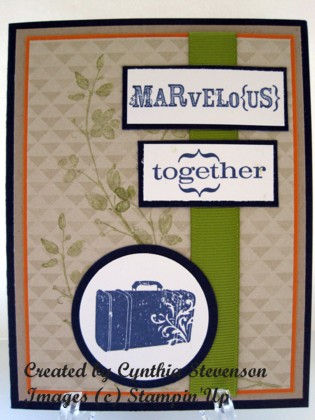 I used the MOJO Monday sketch #143 for my inspiration for this card. The designer paper comes from the Travel Journal Designer Series paper pack(page 23). The colours used are Night of Navy, Kraft(Crumb Cake), Pumpkin Pie, Old Olive and Whisper White. The sentiments are from “In A Word” (page 10) and the image is from the very cute “Sentimental Journey” set(page 22). I didn’t like the empty space above the circle so stamped-off the branch image from “Watercolor Trio” (page 16) in Old Olive Classic Ink. These stamp sets are quite versatile and can be used for just about any theme you wish. This card could be an Anniversary wish or a Bon Voyage wish – your choice.