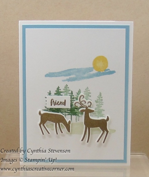 We live outside of town and frequently have visitors – I call them my friendly deer. They help to trim up my flower beds and just look great wandering around our yard. Today’s card was inspired by their visits.