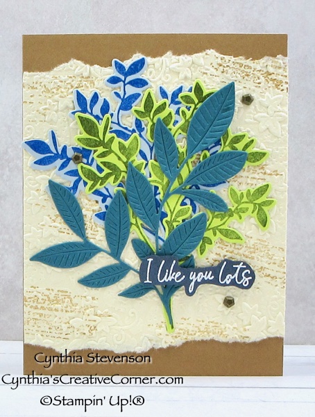 The two leaf sprays were stamped with Blueberry Bushel on Cloud Cover cardstock and Mossy Meadow on Lemon Lime Twist cardstock. The textured leaf spray was cut with the matching die out of Pretty Peacock cardstock.