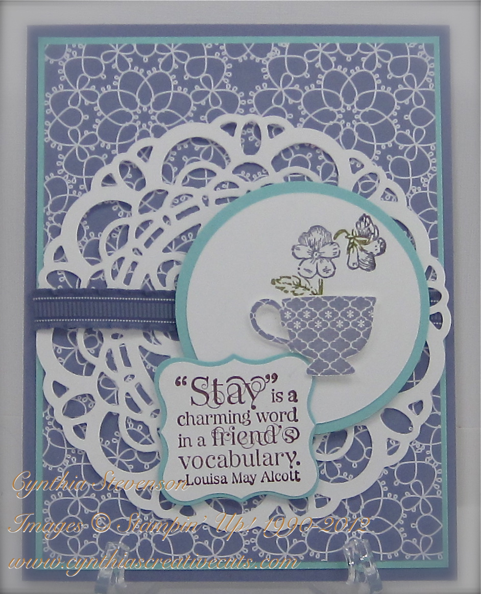It was the perfect opportunity to use the new Sizzlits Large Paper Doily Die and to play with the charming “Tea Shoppe” stamp set. The flower image was colored “Direct to Stamp” with the Wisteria Wonder and Lucky Limeade Markers.