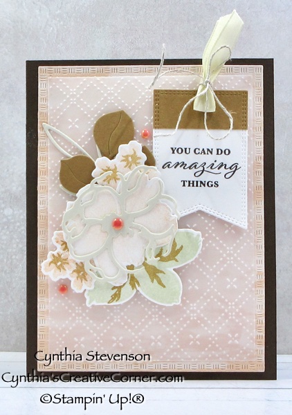 I’m still playing with the Petals of Beauty Bundle(167096) and had fun creating the flowers on this card! To amp up the background mat, I layered this piece of Vellum 12″x12″ specialty paper(167099) over a design from the Brushed with Beauty designer series paper(167082). The vellum mat needed a little texture so I slipped it into the Beautiful Pattern 3D embossing folder(167097) along with a piece of printer paper. Using the printer paper gives the vellum a smooth look without breaking the raised design.
