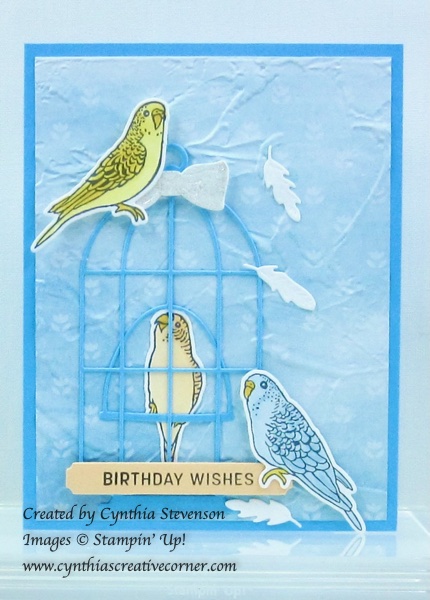 So cute, 3 cheeky budgies from the Pretty Birds Bundle(158847) to bring birthday wishes. I copied the card that’s on page 103 of the Annual Catalogue(bottom right) but used Tahitian Tide cardstock instead. Instead of leaving the designer paper from Awash in Beauty pack(158973) plain, I tucked it into the Painted Texture 3D Embossing Folder to add great background for the cage and budgies. The little bow at the top of the cage was glittered up with the Clear Wink of Stella Glitter Brush(141897).