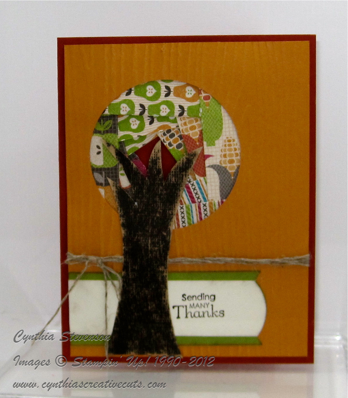 Well, I’ve been creating. Remember the tree in this post? Well, this tree has a definite autumn theme along with showing off the new and great Core’Dinations colorcore card stock! This is a new item that comes in 3 colors(Early Espresso, Cherry Cobbler and Gumball Green) and you can find them on page 6 of the Holiday Catalogue. I used the Stampin’ Sanding Block along with it to give the tree it’s unique character.