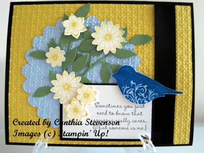 We have Pacific Point, Bashful Blue, Daffodil Delight, Wild Wasabi and Basic Black. I decided to start with a Basic Black card base and go from there. I tucked a piece of Daffodil Delight into the Square Lattice Embossing Folder and ran it through the Big Shot. Then cut a scallop circle using the Scallop Circles Die #2 and embossed it with the Square Lattice as well. The Sizzlets Little Leaves came in handy for the Wild Wasabi. The flowers and bird came from the new Level 1 Hostess set, Punch Potpourri. I don’t have the Two-step Bird Punch, so cut the little guy out using my paper snips after stamping him in Pacific Point on Bashful Blue cardstock. (I just might have to invest in that punch).I really like the sentiments in Occasional Quotes and found a very suitable one for this card and a strip of 5/8″ Basic Black ribbon finishes things off.