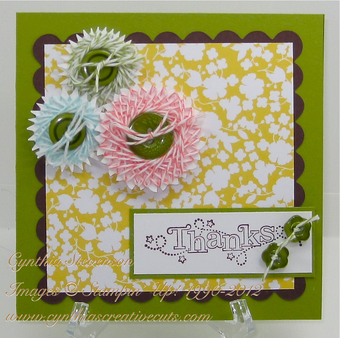 I made the flowers with Baker’s Twine, punched shapes and a tutorial from the March 2012 issue of Cardmaker magazine. (A bit of snipping with scissors created the pinking edge on each circle – better for wrapping the twine.)