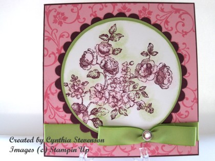 The flourish image from Elements of Style was stamped in Versamark randomly on the Pretty in Pink panel, Clear Embossing powder was added and then heat embossed for a shiny finish. I stamped the main image with Rich Razzleberry classic ink and then, using a Sponge Dauber, added Pretty in Pink and Certainly Celery classic inks.