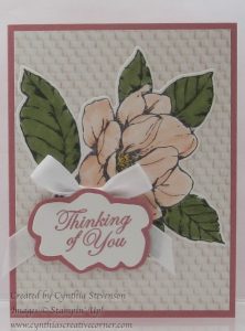 I matched it up with Rococo Rose cardstock to give some contrast to the Petal Pink magnolia. I also got a little “creative” with the mat for the greeting by using the flower outline die from the Magnolia Memory die package(149578). The greeting itself was cut out with that die and then I lightly traced around the outside of the die to create the mat. Sweet!