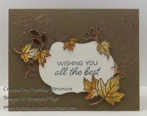 Time is passing and I had to use the Blended Seasons Bundle one more time before it goes away! Don’t you just love the copper embossing? I decided to use some of the Brusho®Crystal Colour and an Aqua Painter to so I could emboss another of that beautiful spray of leaves. Then all it took […]