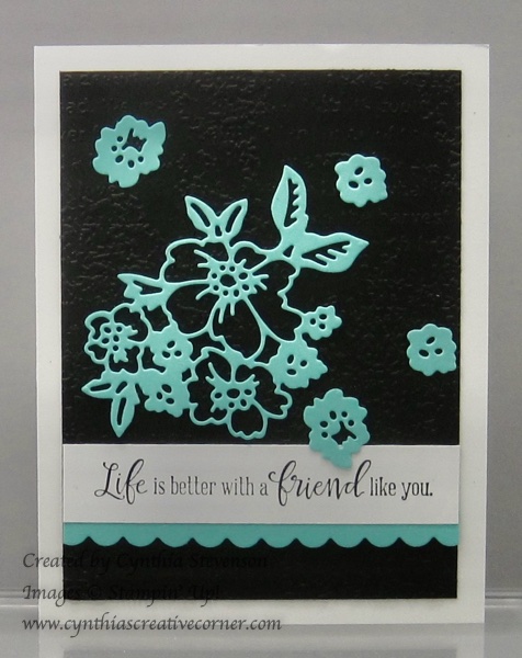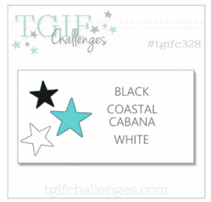 I love the Coastal Cabana against the black, don’t you? It is so striking and pretty! I took the greeting from the Peaceful Moments stamp set(151595) and lined it with that lovely scallop from the Penned Flowers Dies(155557) and while I was at it cut out those oh-so pretty flowers too!