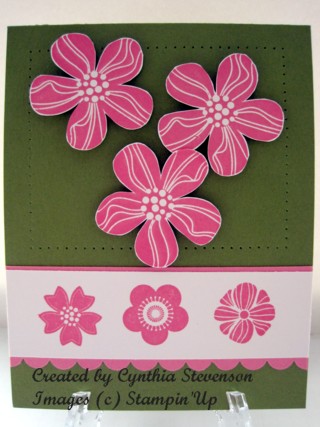 The second card on the right, uses a Rich Razzleberry Base with Old Olive and Whisper White. The branch image was stamped with Old Olive Classic Ink randomly on the panel. The flowers were stamped on a separate piece of paper, cut out and adhered to the image as well. The Scallop Edge punch was used on one side of the Old Olive Panel to give a little extra to the card. You could leave it as a straight edge for an equally lovely look.